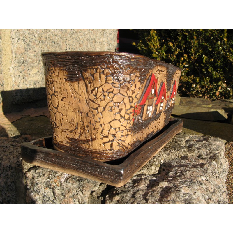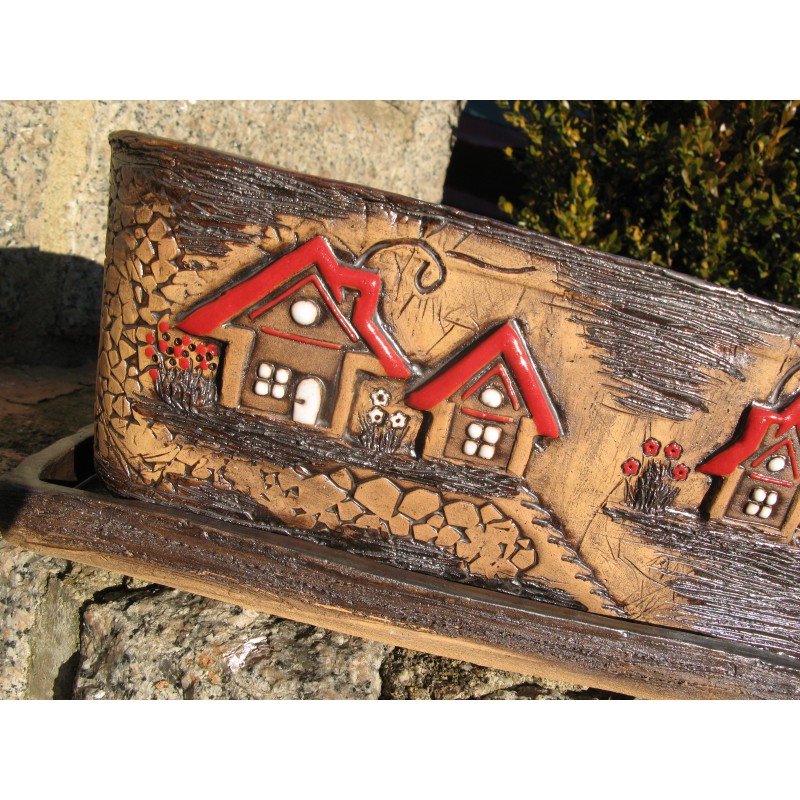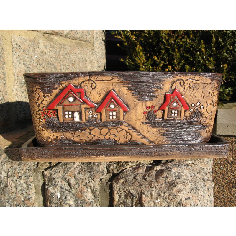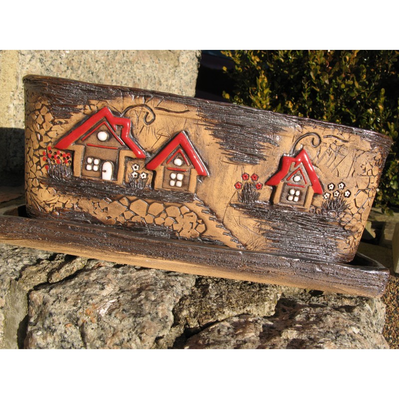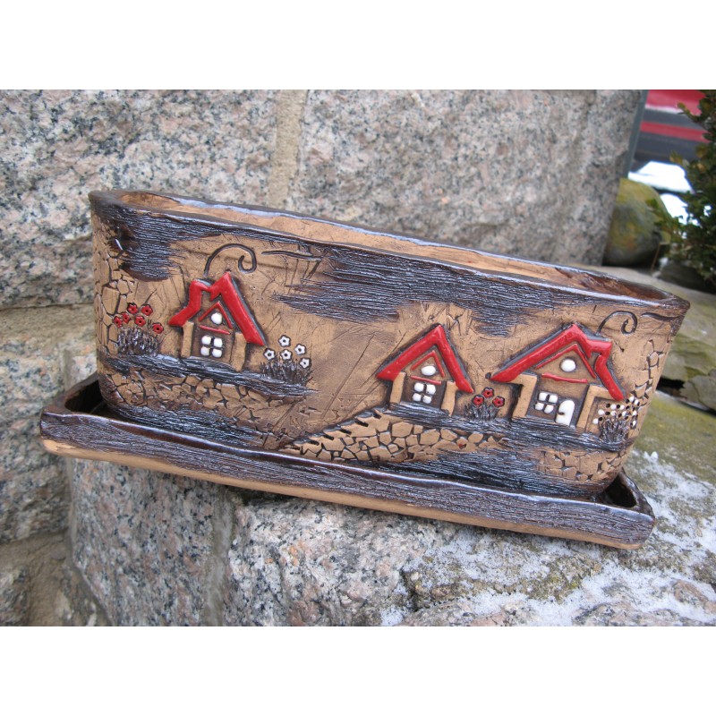 Truhlík z krémové hlíny - dekorace domečky, po obvodu je dekor kamenů.